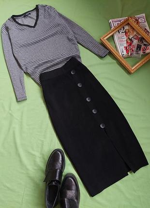 Универсальная юбка миди-карандаш🖤 И в пир и в мир Тонкий мягкий трикотаж (тонкий рубчик) Пояс резинка широкая Украшение ряд пуговиц обманки+разрез Без карманов Без подклада ,но не светиться совсем Размер 44-46