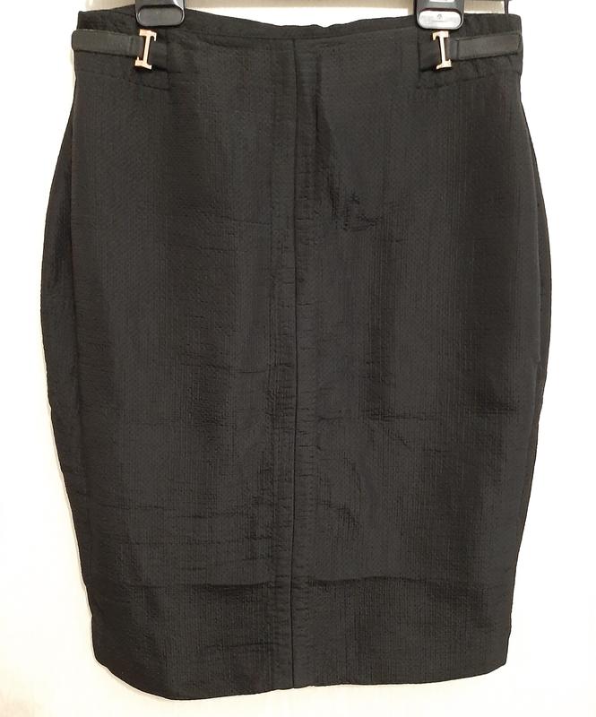 Юбочка чёрная, классическая,,бутоном". .. брендовая.На талии по сторонам-украшения ввиде золотых ремешков.Замок сзади..внизу шлица-разрез тоже на потайном замочке ..Есть подюбник..( чехол) Пот-38 Поб-48 Низ заужен-42 Длина-60 Разрез-шлицы сзади-23 см.(закрывается) Made in Portugal.
