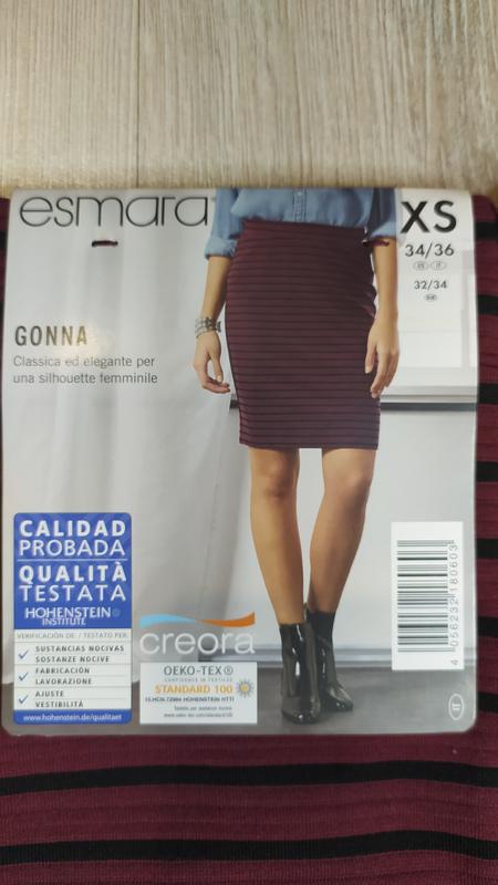 Спідниця-олівець Esmara Німеччина склад: 25% віскоза, 73% поліестер, 2% еластин - тканина не тонка, фактурна, тягнеться в поясі широка гумка. ззаду невеликий розріз, блискавка Розмір XS 32/34 euro по поясу ПО 33 см, замер в районі стегон приблизно ПО 40 см, довжина 50 см Нова. з етикеткою.