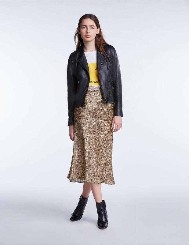 Приталена шовкова спідниця з леопардовим принтом Довжина міді, блискавка збоку, злегка розширюється донизу Ідеально поєднується з в'язаним джемпером. Склад: 70% віскоза, 30% шовк ПОТ - 44см ПОБ - 52см Довжина - 82см