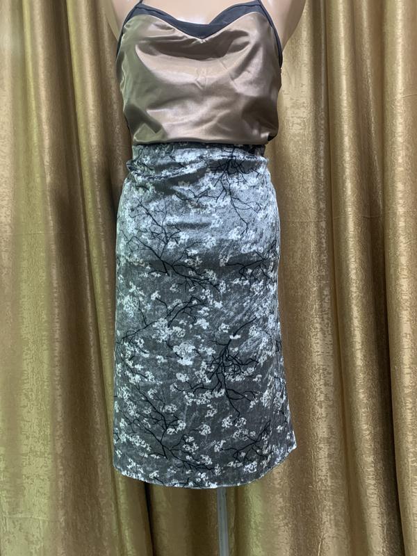 Велюровая юбка миди с нежным цветочным принтом на резинке размер xl/xxl Цвет комбинированный серый, белый Пояс на резинке Без застёжек Длина 56см Полуобхват талии 47-60см, пояс на резинке Полуобхват бёдер 56-60см Низ 55см Состав 100% полиэстер, велюр, отлично тянется, мягкий, приятный на ощупь