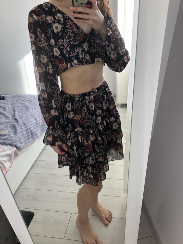 Юбка и кроп топ в цветочки в идеальном состоянии. Можно купить вместе как костюм или по отдельности, Размер с Юбка на резинке и подкладке, топ можно носить с двух сторон, там где вырез были завязки, но я их обрезала (видно на последнем фото) Топ - 100грн, юбка 200грн, набор 300 грн