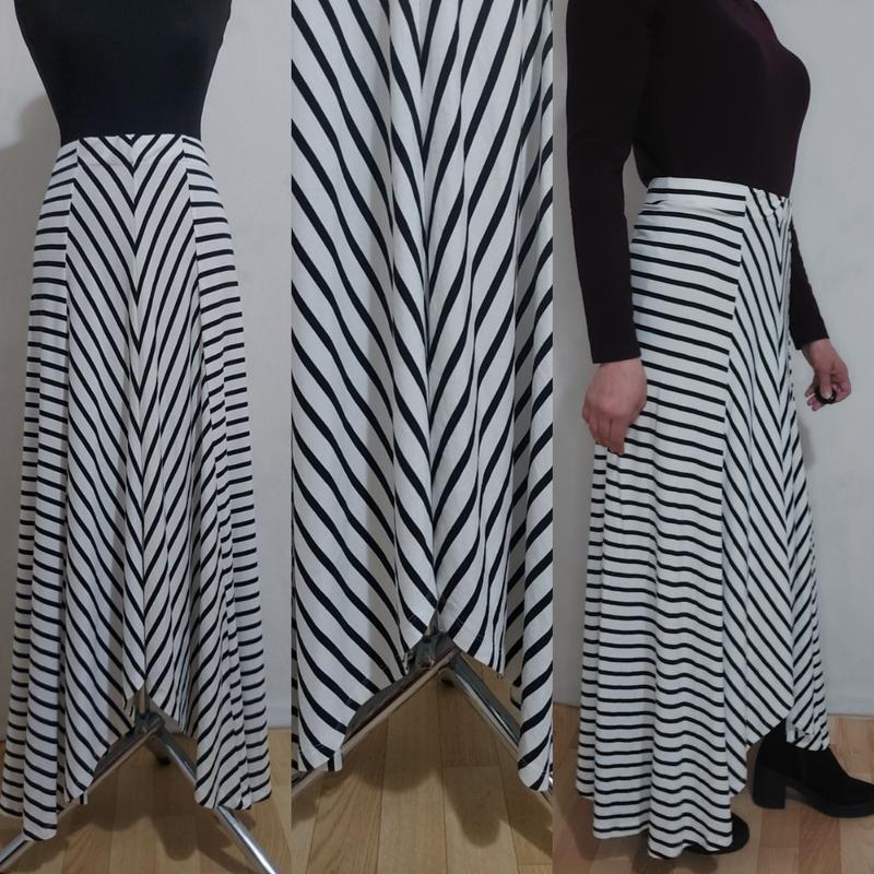 Состояние 10/10 новой Пояс на резинке Необычный стильный крой Эластичная В составе 95%- вискоза, 5%- эластан Указан размер 42/44, см замеры Одета на 164/С, большая ПОТ-37, тянется на резинке до 50++ ПОБ-58 длина изделия по боковому шву-71 посередине-98,5+-