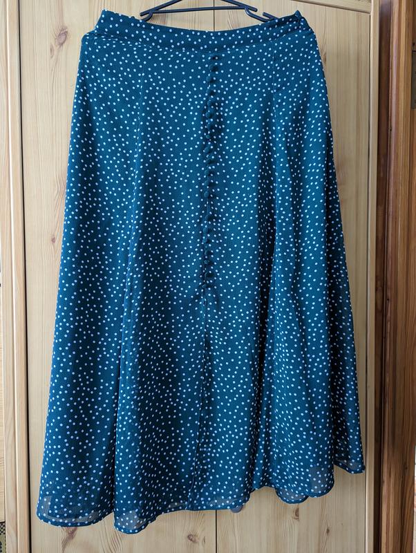 юбка в горох Reserved 38 материал шифон на подкладке. Очень легкая, свободная, сбоку на молнии, по центру декоративные пуговицы. Цвет темно зеленый (переднего фото). Стан - идеальный.