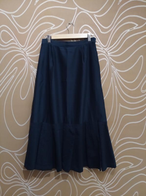 Необычайно красивая, глубокого темно синего цвета женская юбка известнейшего бренда одежды! Крой юбки сделан в стиле ретро, длина миди. Очень красиво сидит на теле, подчеркивает бедра и талию! К низу расширяется, сделана складками. Ткань в полоску, которые между собой разделены как бы мелкими дырочками, как перфорация. Есть подкладка, поэтому не просвечивается. Оооочень красивая!!! Покупала себе в фирменном стоковом магазине, но одела всего один раз. Как новая, никаких следов носки и дефектов нет! Замеры: ПОТ, пояс-34 см Длина -83 см ПОБ-54 см Змейка сбоку.