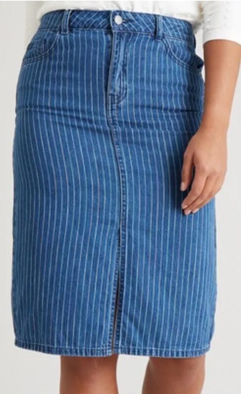 Стильна джинсова спідниця карандаш з розрізом попереду , у смужку , ПІТ 37 , ПІБ 48 , довжина виробу 67 , розріз 23 .