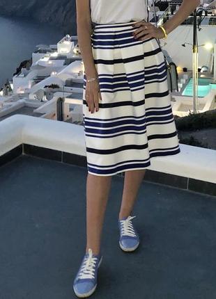 Юбка в длине миди фасона клеш в полоску. Что важно, в месте шва все полоски сходятся, создавая вид аккуратной вещи. Основа юбки белая, полоски голубые и темно-синие. Ткань плотная, будет хорошо держать форму. Замеры: длина 68 см, пот 30 см (на тоненькую девочку), бедра свободны.