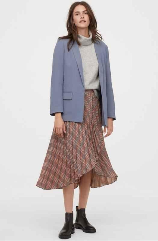 Плиссированная юбка до колен из жаккардового переплетения с завышенной талией и вшитой спереди накидкой с асимметричным подолом. Потайная молния и пуговица с одной стороны. Без подкладки длина по попе-85 см, длина спереди в самом коротком месте-61 см, пояс-38 см, ткань не тянется