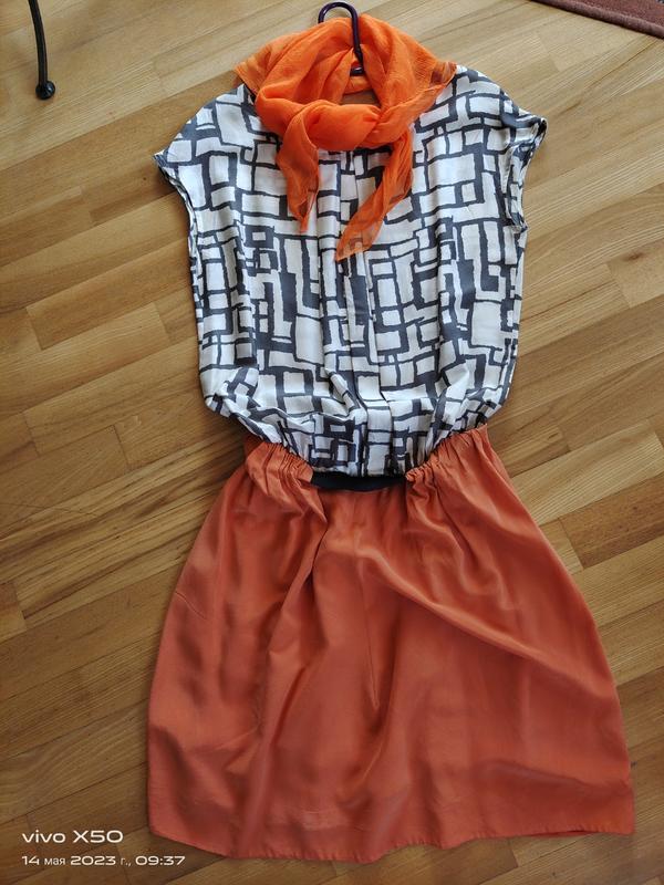 Невероятного качества платье Marni, с отличным составом шелк/коттон, талия занижена на бедра, очень интересный фасон, стильно смотрится. На фото оранжевый получается насыщенным, в реальности он очень спокойный, приглашенный, камера так не передает. Длина 99-100, но за счет заниженной талии и резинки будет немного короче, пог 50 в спокойном состоянии, там есть складки, поэтому идет свободно, заниженная талия на резинке, она почти на бедрах. Продается вместе с шелковым платонкой в тон. Оплата на картку.
