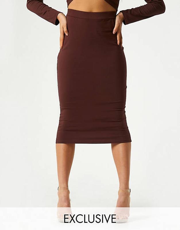Стильная трикотажная коричневая юбка-миди Boohoo Новая, с этикеткой Сток, может иметь запах обработки, пойдет после стирки Мягкий тонкий приятный трикотаж вискоза с эластаном В поясе резинка Красивый шоколадный цвет Универсальная базовая юбка Размер 12 евро 40 Длина 70см, ПОТ 36см, ПОБ 43см,по низу 39см