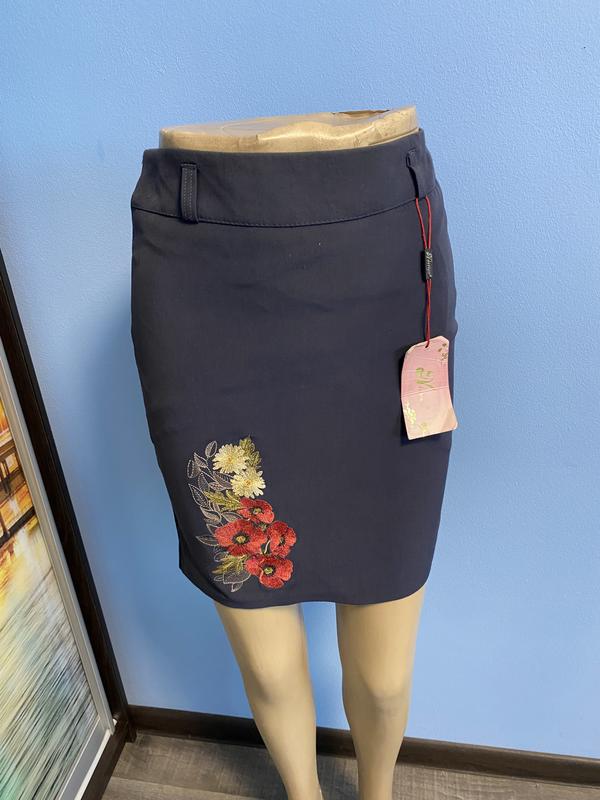 44 размер, объем талии 36, длина 45-46, имеет нашитые цветы, сзади разрез 9 см
