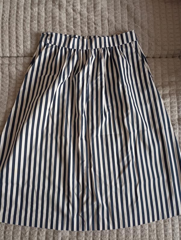 юбка в полоску - отлично для моря, пляжа,на лето. сбоку карманы, молния - сзади. А - силуэт. ткань коттон, держит форму, длина миди, состояние идеальное. ПОТ - 36 см. Не тягнеться. довжина по краю - 69 см.