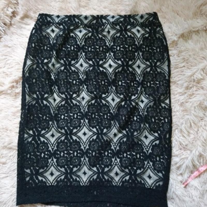 На контрастной подкладке, талия 42, бедра 50, длина 63 (гипюр) и 57 (подкладка)