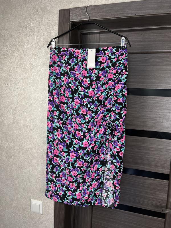 Літня спідниця з квітковим принтом красивого забарвлення; з лівої сторони спереду глибокий розріз, який переходити в шов, стягнутий на резиночку з декоративним шнурком, що надає оригінальність виробу;пояс збоку на замочку ;тканина м'яка, як щільний шовк; склад 100% натуральне волокн, вискоза,; відомого британського бренду F&F. Заміри: довжина -82; побіди-65. 5; глибина розрізу - 36;обхват низу - 143;обхват поясу-98. Розмір uk-20 на укр 54-56, есть еще под эту юбку босоножки из искуственной кожи 40 размера новые в коробке цена босоножек 1200 гривен, на последнем фот показала, цвет босоножек, точно как цвет розовый на юбке один к одному оттенок, смотрится все вместе супер круто! На юбке высокий разрез и с этими босоножками просто бомба, они очень удобные и подходят на широкую ногу тоже,