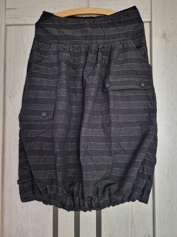 Стильная юбка, снизу стянутая резинкой, разрезы по бокам на пуговицах. Размер XS, но подойдет от S к L. Пот 37, растягивается до 47. По стегон 70 длина 70 Отправлю безопасной доставкой при условии полной оплаты на ШАФУ новой по почте, доставка Укрпочтой по полной подписке на карту.