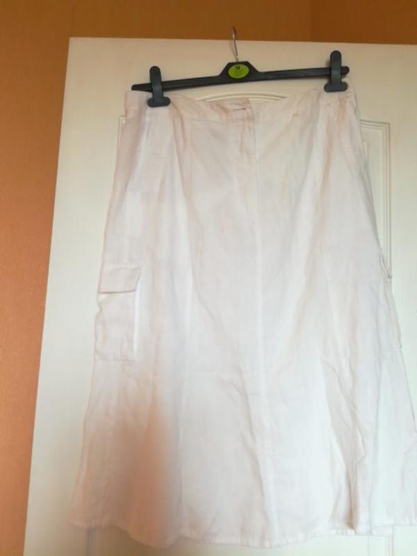 цвет белый.Состав 100% лен.Качество льна и пошива впечатляет.Два глубоких кармана боковых.Два накладных кармана с клапанами.Карманы объемные.Много ручных швов.Юбка из клиньев состоит.ПОТ 45см.ПОБ 55см.Длина 73см. Полуширина внизу 78см.Состояние очень хорошее.Размер 42.Сзади пояс на резинке.