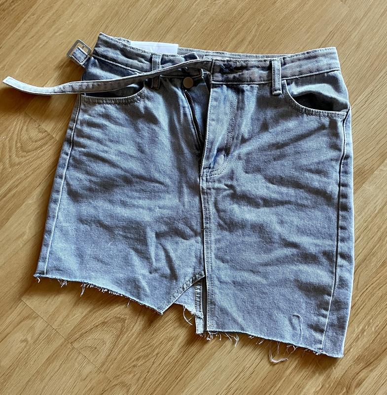 Джинсовая интересная юбка. Разной длины спереди и сзади. Купила себе. Не подходит размер. По наборке Л, вообще идет на С. Затягивается поясок.