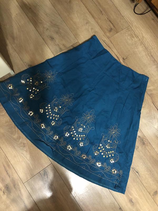 Короновая, размер м-л, с подкладкой, узор с пайетками, размер м-л, замеры дам, сзади потайной замок. Цвет морская волна, более до синего.