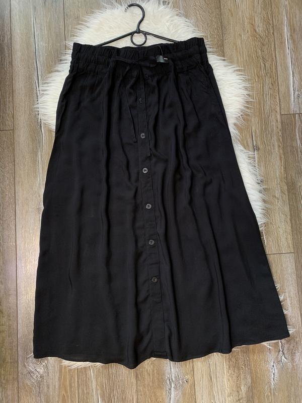 Новая черная юбка, размер XL. На талии есть резинка, затягивается. Застежка на пуговки по всей длине.