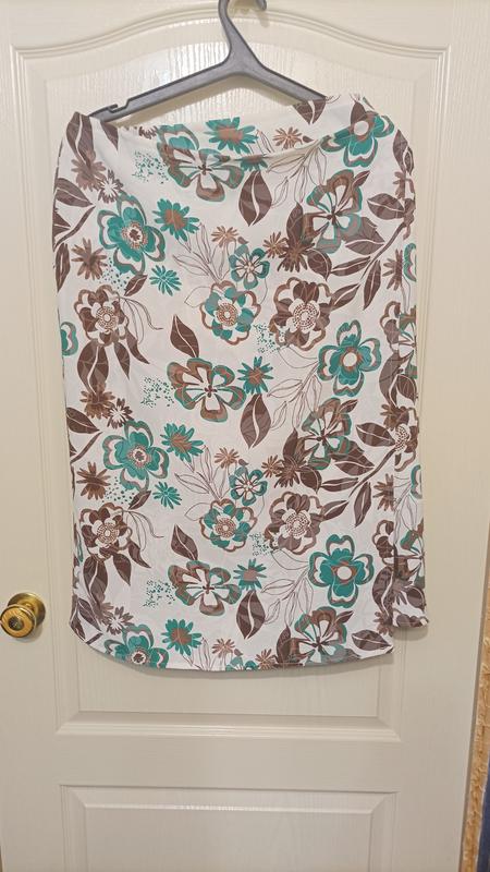 Дуже зручна та гарна літня спідниця на запах.Розмір L/48+ ще 2.Довжина 76см.Ширина 1,45. Розмір корегується зав'язками на талії.Тканина щільна,не мнеться,що дуже важливо.