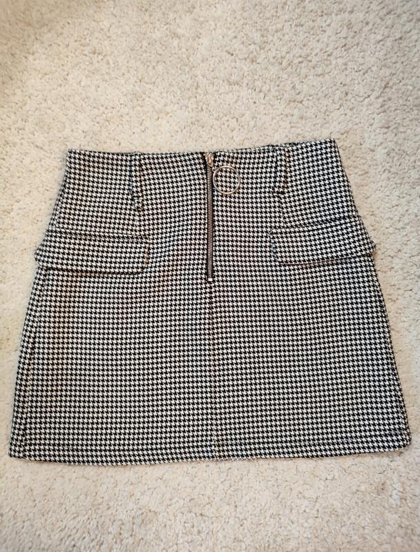 Новая юбка от бренда Bershka. Юбка застегивается молнией, приспущенная имитация карманов спереди, есть потолки для пояса. Цвет черно-белый. Длина - 39 см.