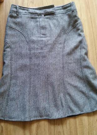 Напівшерстяна тепла спідниця,тканина сірого кольору у дрібну чорну ялинку,блискавка спереду,нижче коліна,гарно підкреслює фігуру,до низу трохи розширена,довжина 62 см,ширина в поясі 76 див. Стан дуже хороший.