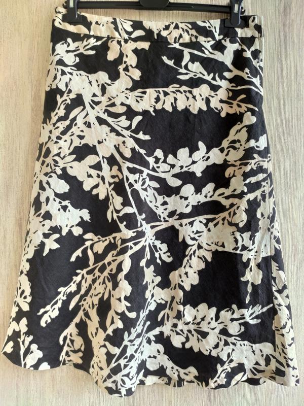 Тотальный распродаж. Закрываю магазин. Юбка длиной миди в абстратно-растительный принт от шведского бренда h&m Крой максимально прост - А - силуэт, поэтому подойдет для любой фигуры. Застегивается на боковую молнию. На ярлыке указан размер 38 (М). Состав ткани 100% лен. Ткань высокого качества, гладкая, достаточно плотная, поэтому юбка красиво держит форму. Юбка не просвечивается, так как в дополнение есть еще тонкий подклад черного цвета. Стан идеален. Выглядит как новая вещь. Заміри. НОТ 41,5 см НОС 54 см Длина 73 см