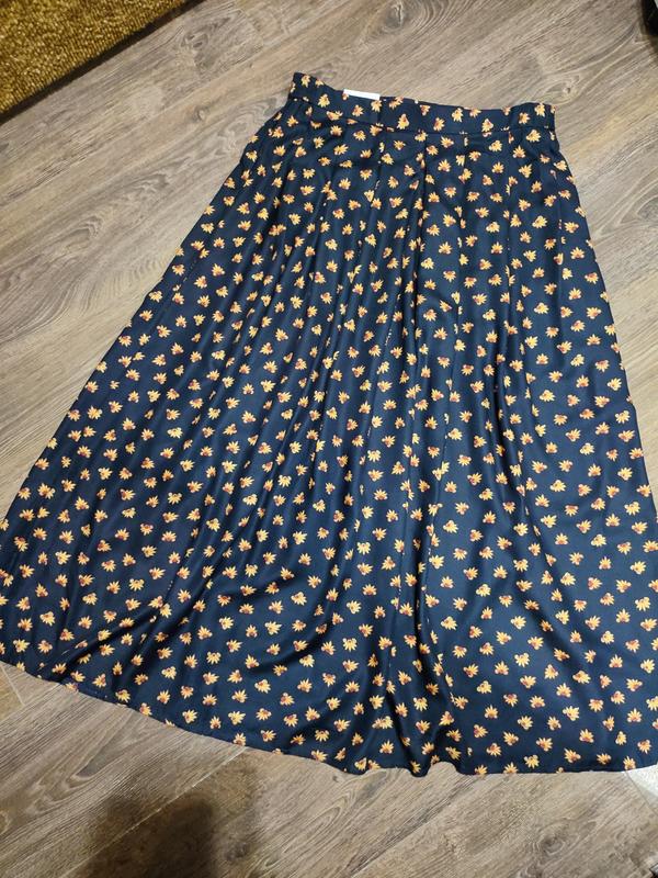 Спідниця, довга, широкий пояс, вгорі складки, які до низу дають хороший об'єм, по боках внутрішні кармани, застібка блискавка, 100% віскоза, хорошої щільності тканина, чудово тримає форму, красиво спадає донизу складками, цікавий принт, колір такий, як на фото з бірками. Розмір вказано 12, орієнтуватися на заміри: ПОТ 37см, довжина 86см. Стан відмінний. Фото на тілі не має. Робіть вибір свідомо, повернення не має.