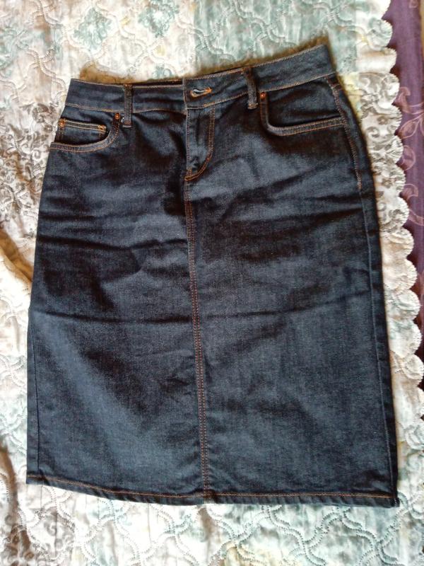 Довжина 57 см, піт 36 см. Джинс. Тягнеться. Ззаду розріз. Ззаду кишені прикрашені камінчиками. Спереду кишені. Застібка на блискавці та ґудзику.