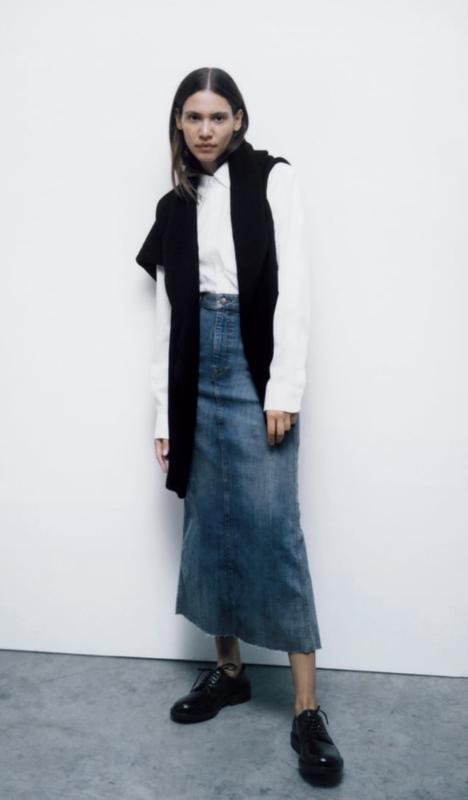 Варенная джинсовая юбка с высокой посадкой, пятью карманами, шлевками для ремня и необработанным низом. Застегивается на молнию и пуговицу спереди. В наличии размер М. Оригинальный. Нова. Со бирками.