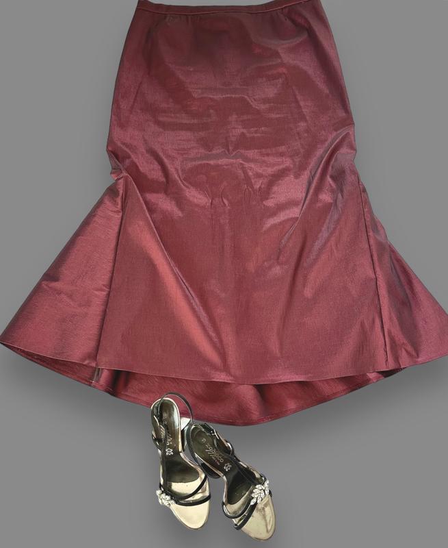 Темно-бордовая юбка из тафты, спереди немножко короче, сзади длиннее Длина 97см перед, 108см спинка ОТ 96см ОБ 118см