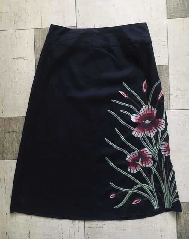 Очень красивая юбка с вышитыми маками. Благородный шлифованный лен, глубокий черный цвет, оригинальная вышивка - это любовь. Застегивается сбоку на молнию плюс пуговицу. ПОТ 37, ПОС 51, длина 70см