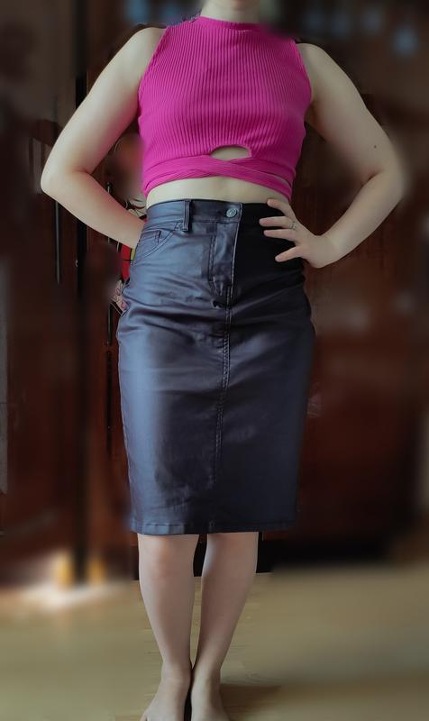 Юбка с кожаным напылением, смотрится шикарно, новая, купила, но оказалась большая. Только раз примеряла. Полуобхват талии-38 Полуобхват бедер-46 Длина-61 Юбка тянется.