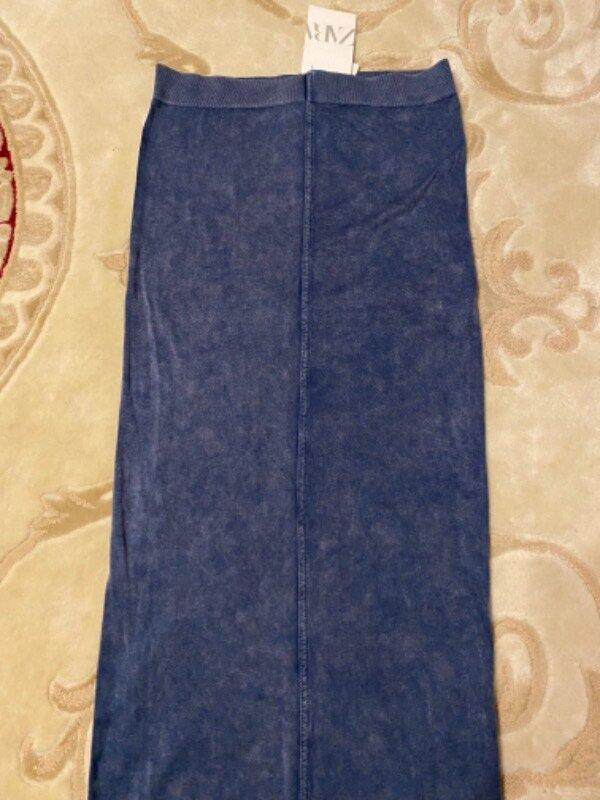 Юбка сильно стрейчевая, джинсового кольра, размвр М - Л указана. Длина - 80см, пояс- 33см полуобъем, к 54см тянется, поб - 37см, тянется до 59см, внизу 37см полуобъём.
