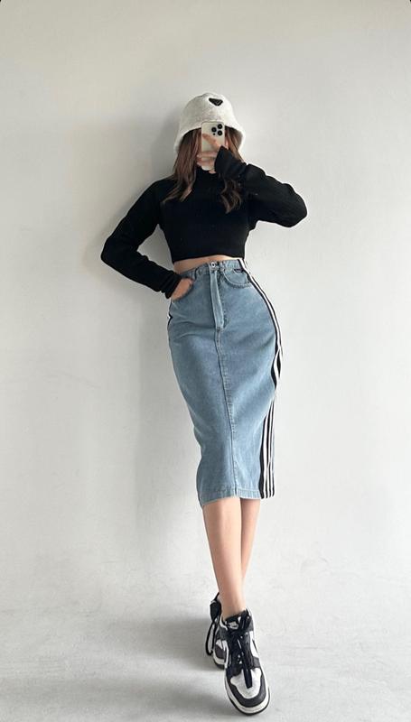 Стильная джинсовая юбка. Плотная джинса с лайкрой. Длина ниже колена (midi), сзади с разрезом, пояс со вставками резинки. Также за счет элементов лампаса отлично садится по фигуре. Производство Турция. ЗАМЕРЫ: ПОТ/ПОБ/длина M - 39/47/72 L - 39/49/72