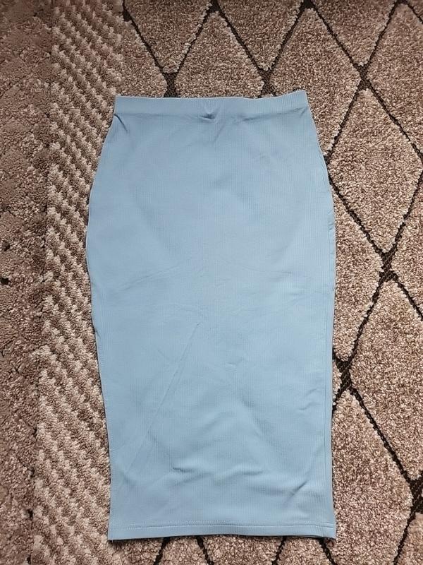 Стрейч, нежно-голубого цвета, в рубчик, с разрезом сбоку