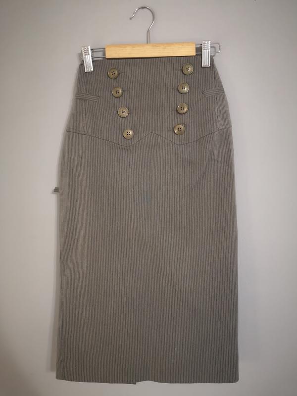 Крутая миди юбка, которая выгодно подчеркнет вашу фигуру. Высокая посадка. Отличная декорация пуговицами. Застегивается на молнию и дополнительную пуговицу. Внизу маленький разрез. Присутствующий подклад. Все выполнено качественно. Без дефектов.