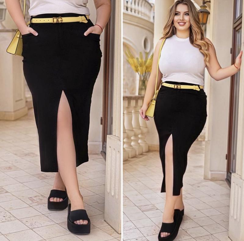 Останній розмір 50-52 Кольори : чорний Тканина : джинс-коттон Спідниця нижче колін , з боків кишені , пояс на застібці + ґудзик , з переду фігурний розріз, є бретельки під поясок Параметри моделі-батал 108-86-110, зріст 165см, на ній 50-52 Параметри виробу по зовнішньому шву: 50-52: ОТ80-90 см ОС 95-112 см. довжина спідниці 89 см, розрізу з переду 47см;
