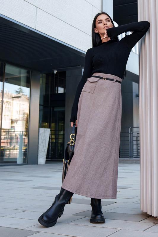 Прошу звернути увагу! Пояс в комплекті не іде! Тепла міді-спідниця А-силуету із щільної тканини - знахідка для осіннього та зимового гардеробу. Лаконічний стиль буде доречний і зі світлою сорочкою або жакетом, і з контрастною водолазкою. А універсальна довжина спідниці дозволяє носити її з різним взуттям. Враховуючи нейтральне забарвлення, таку спідницю легко можна вписати в офісний гардероб. арт.J000083 Тканина: шерсть-діагональ Склад: 50% акрил, 44% поліестер, 6% шерсть Колір: сірий, коричневий, графіт Розмір: S, M, L, XL, 2XL,3XL Параметри моделі на фото: Зріст: 170 см, ОГ: 86 см, ОТ: 64 см, ОС: 93 см. На фото представлена модель розмір S (42/44). Комплектація: спідниця Прошу звернути увагу! Пояс в комплекті не іде! Фактичні виміри по виробу: Об’єм по талії: S-64-66; M-68-70; L-72-74; XL-76-78; 2XL- 82-84; 3XL- 88-90; Об’єм по стегнам: S-94; M-98; L-102; XL-106; 2XL- 110; 3XL- 114; Довжина виробу по боку: S-93; M-93; L-93; XL-93; XXL- 93; Ширина шльовок під пояс: 3 см *Тканина помірно тягнеться до 2 см Посадка: висока талія Силует: трапеція, 4 - клинка Застібка: блискавка на спинці Кишені: накладний карман з клапаном Декоративні елементи: шльовки по талії