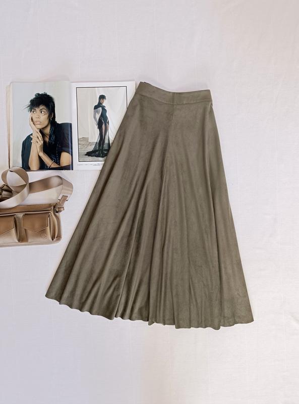 спідниця міді оливкового кольору від Zara, тканина з ефектом замшу Розмір:М Заміри: ширина поясу 34 см, довжина 80 см