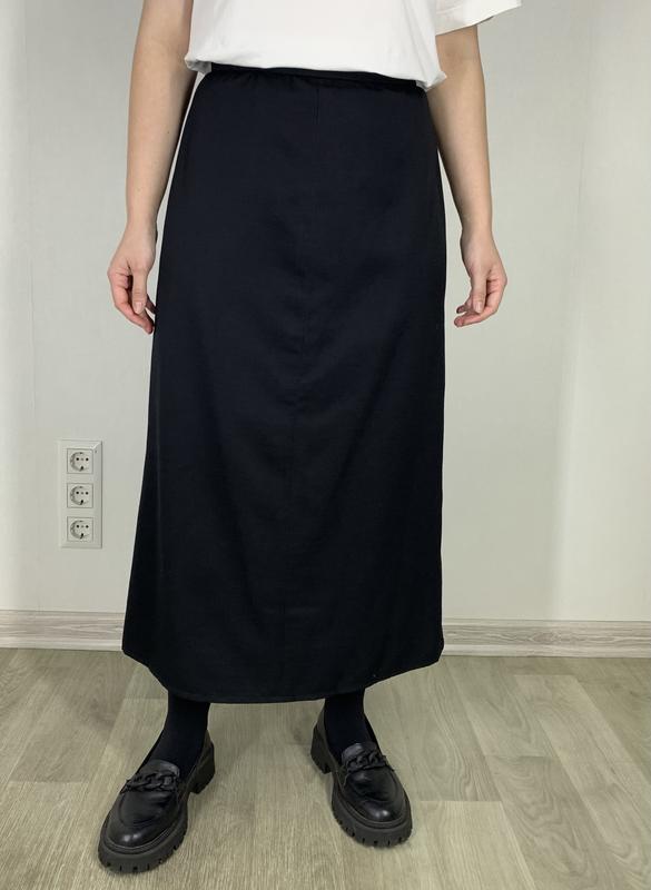 Спідниця міді, чорного кольору На розмір М-Л Бірок немає, тканина цупка, спідничка має підклад Довжина 90 см, напівобхват талії 39 см, напівобхват стегон 53 см Стан ідеал Вдягнуто на розмір Л, зріст 167