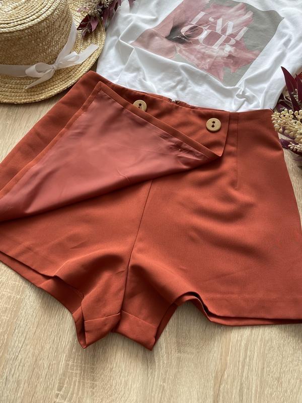 Теракотові шорти, спереду виглядають як міні спідничка з вінтажними ґудзиками у два ряди Чудово виділяють фігуру, зручні в носці Підійдуть під будь який образ Стан ідеальний Пот 35 Поб 51 Ширина ноги 32 Посадка 35/43 Довжина збоку 34
