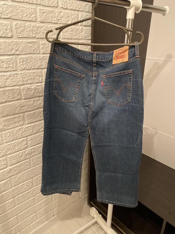 Джинсова спідниця Levi’s, високої якості, в довжині міді. Розріз спереду та позаду. Кольор navy blue. Розмір L Талія 43, стегна 52, довжина 79