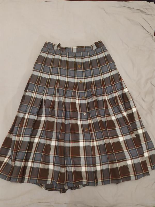 юбка в идеальном состоянии нюансов нет. сзади молния. спереди декоративные пуговки и внизу разрезик. по бокам на поясе вставлены резиночки для корректировки объема талии. на поясе есть шлейки для ремешка. складки до бедра застрочены. на подкладке. пот 38-41см длина 77см на меньший объем талии надо в поясе вставлять резиночку