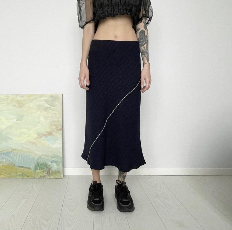 Спідниця міді зі стрічками зі страз upcycle Спідниця синя, костюмні лінії червоні, спереду і ззаду по одній стрічці зі страз Пояс на резинці, тож підійде як на XS, так і на М