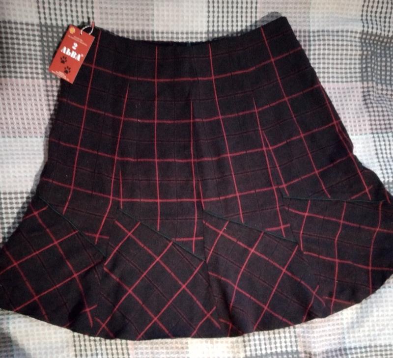 Тепла спідниця у клітинку, застібається збоку на блискавку. Напівобхват талії 40 см, довжина 54 см. Розмір L, орієнтовно 48. Тканина м'яка, приємна на дотик. На етикетці склад тканини не зазначений. Колір темно-бордовий, контури клітинок червоні. Виробник український, 2 Льва