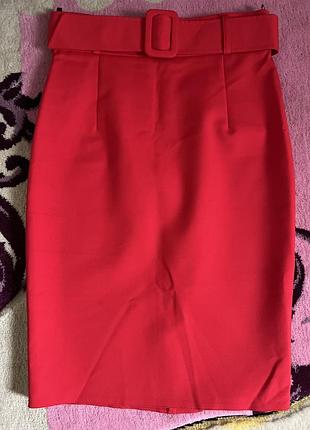 Юбка красная классическая с стильным поясом. Ткань очень классная)