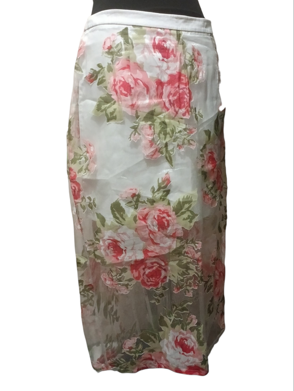 Спідниця біла, по верху прозорий шар з квітковим принтом. Застібується на блискавку. Розмір вказаний UK14, маломірить на UK12. ПОТ 41, ПОБ 55, довжина 77 #11021