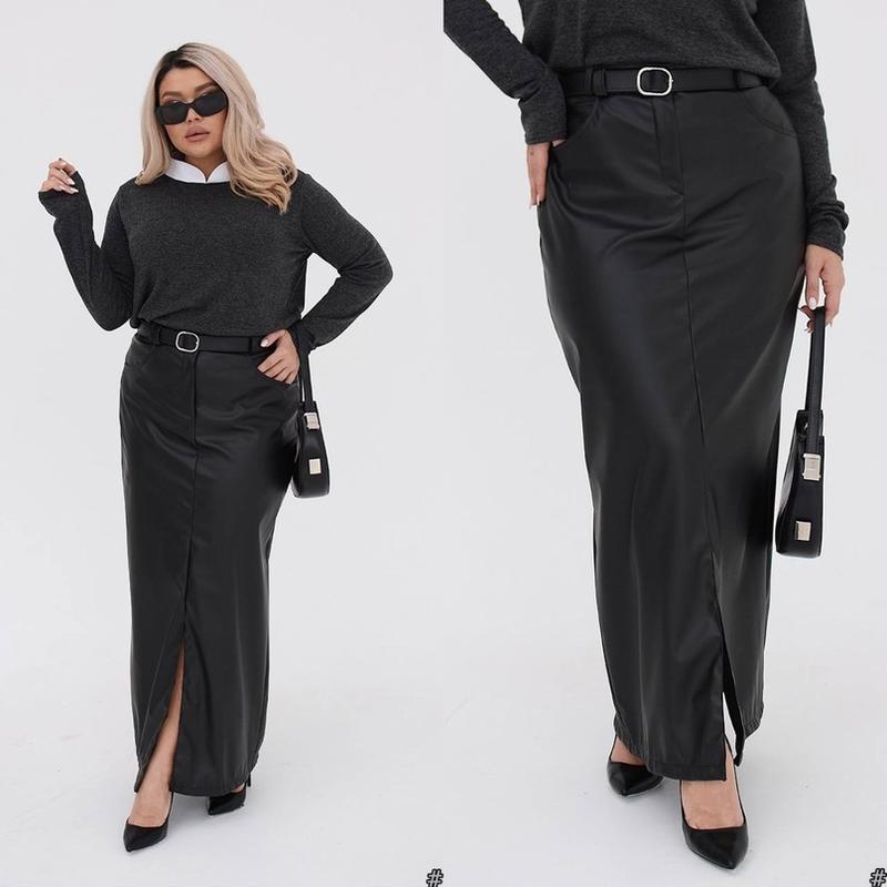 Трендова спідниця Спідниця довжини міді із еко-шкіри чорного кольору. Модель з розрізом спереду та високою посадкою!! Застібається на блискавку та ґудзик. Сміливість та елегантність в одному образі!!! Розміри : 48-52,54-58 Тканина : єко шкіра на трикотажі. Пояс окремо чорний + 130 грн Заміри : 48-52 ОТ 84 до 86 см ОБ 108 плюс тягнеться Довжина 100 м 54-58 От 92 до 94 см ОБ 116 плюс тягнеться ии