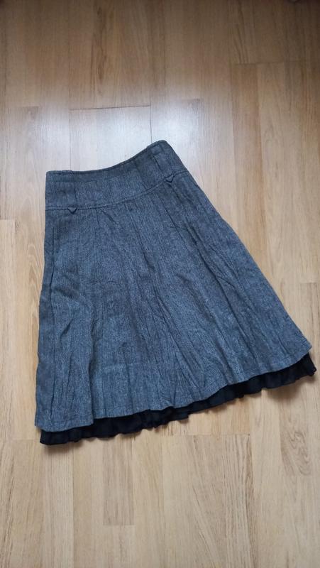 В складі 50 % вовна, віскоза і поліестер. Спідниця тепла, на підкладці, тканина жатка. Довжина 60, нот 41, бедра вільно. Стан гарний, тільки зовсім трошки катишок по тканині, але їх не видно.
